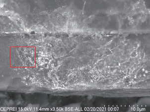 放大焊接点观察存在刮伤现象,从导线变形形状分析是从上面压下,且有一道划痕,变形是由顶部施加外力导致,如图8、图9 所示。