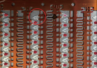 框架放置错位,设置到模具上,引线框架的边缘被切断,并造成金属碎片,金属碎片再现,产生类似于失效的金属碎片,与故障现象相同,如图36、图37 所示。