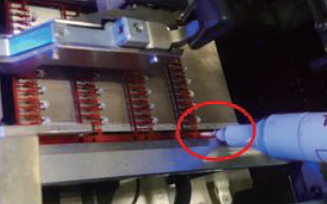 图5 导线)输出侧导线变形、刮伤,分析为人员手动拔线时镊子误触到相邻产品所致,如图6、图7 所示。