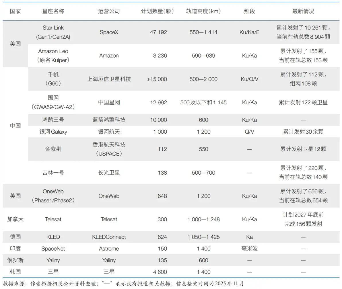近些年,出于国防安全与国家战略需求,世界主要国家在争夺低轨卫星领域主导权方面愈演愈烈。例如,美国SpaceX“星链”截至2025年6月已部署超8800颗卫星,构建起全球最大低轨卫星网络;欧洲议会推进“安全连接计划”(IRIS2),拟于2027年建成自主通信卫星群;俄罗斯推进“球体”项目,计划2024—2028年部署600余颗卫星;中国依托航天集团推进“星网”建设,规划部署近1.3万颗卫星。当前,受卫星制造、火箭发射等技术壁垒制约,全球低轨卫星“圈地战”主要集中于美国、中国、俄罗斯及欧洲。从当前格局看,美国凭借先发优势与技术积累领先地位短期难以撼动,未来将呈现美国领跑、其他大国依托低成本创新加速追赶的“一超多强”态势,如表4所示。